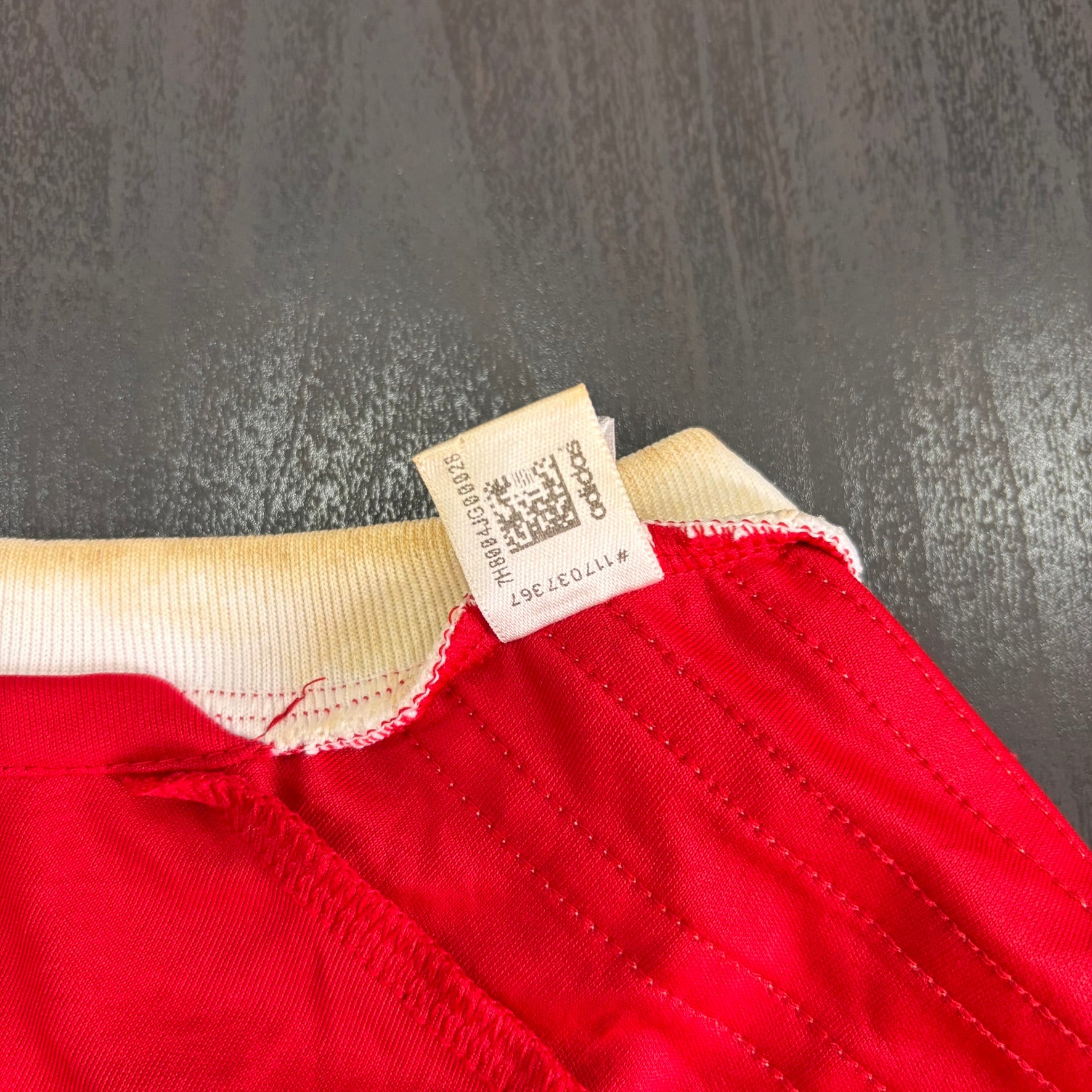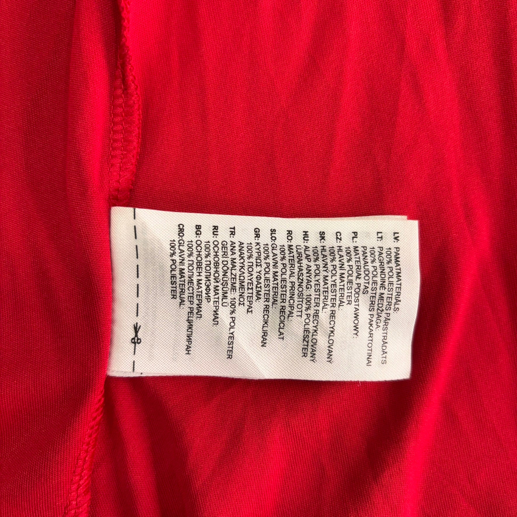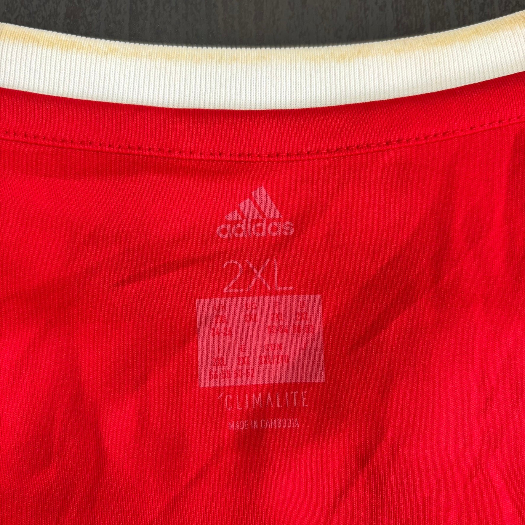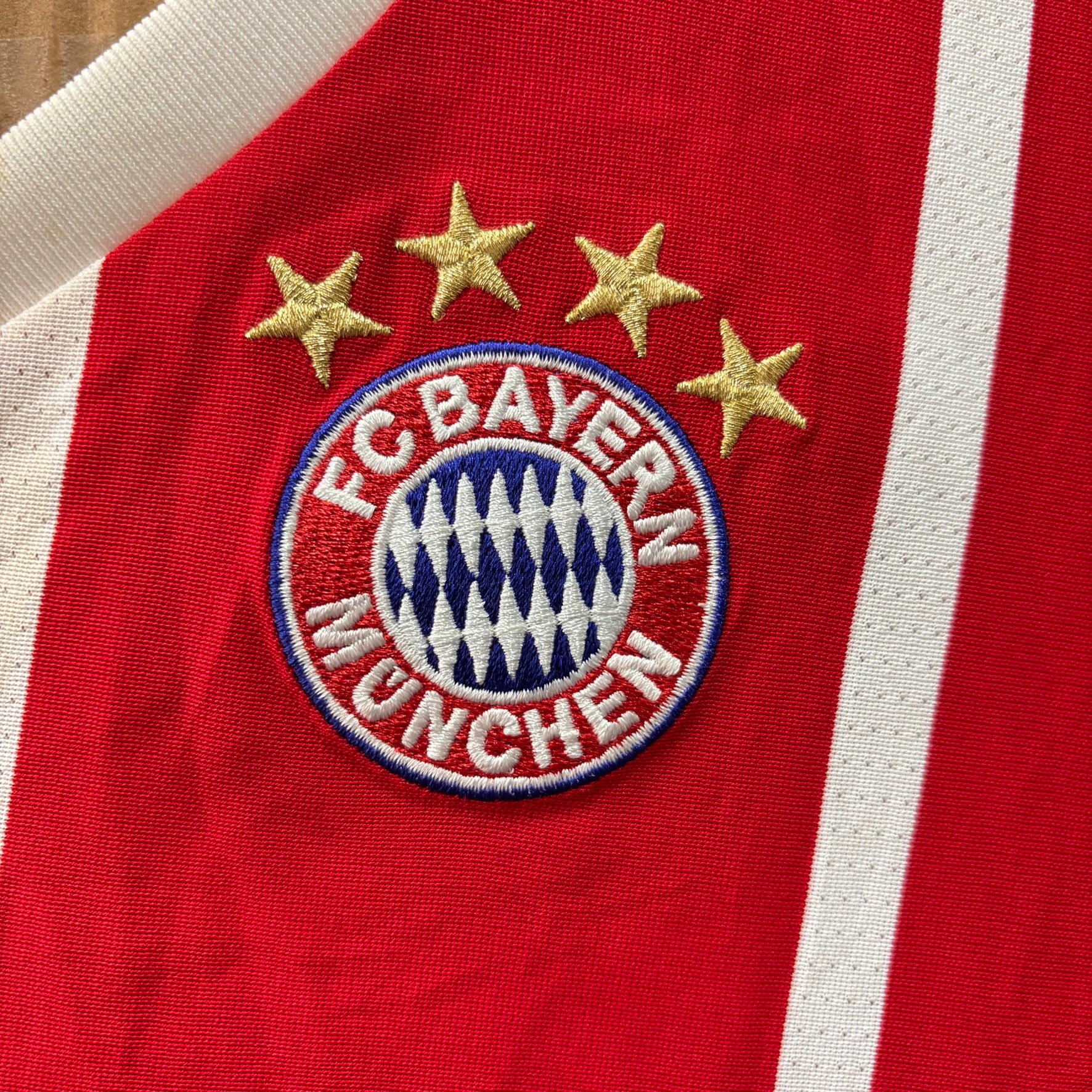 Camisola oficial do Bayern München em vermelho, modelo Climalite, com respirabilidade elevada e toque leve. Possui gola em V com acabamento branco, listas Adidas nos ombros, escudo do clube com estrelas bordadas e patrocínio frontal. Nas costas, inscrição “Bayern München”. Painéis laterais e mangas com recortes brancos e azuis, garantindo contraste clássico do clube. Confeção em 100% poliéster técnico.