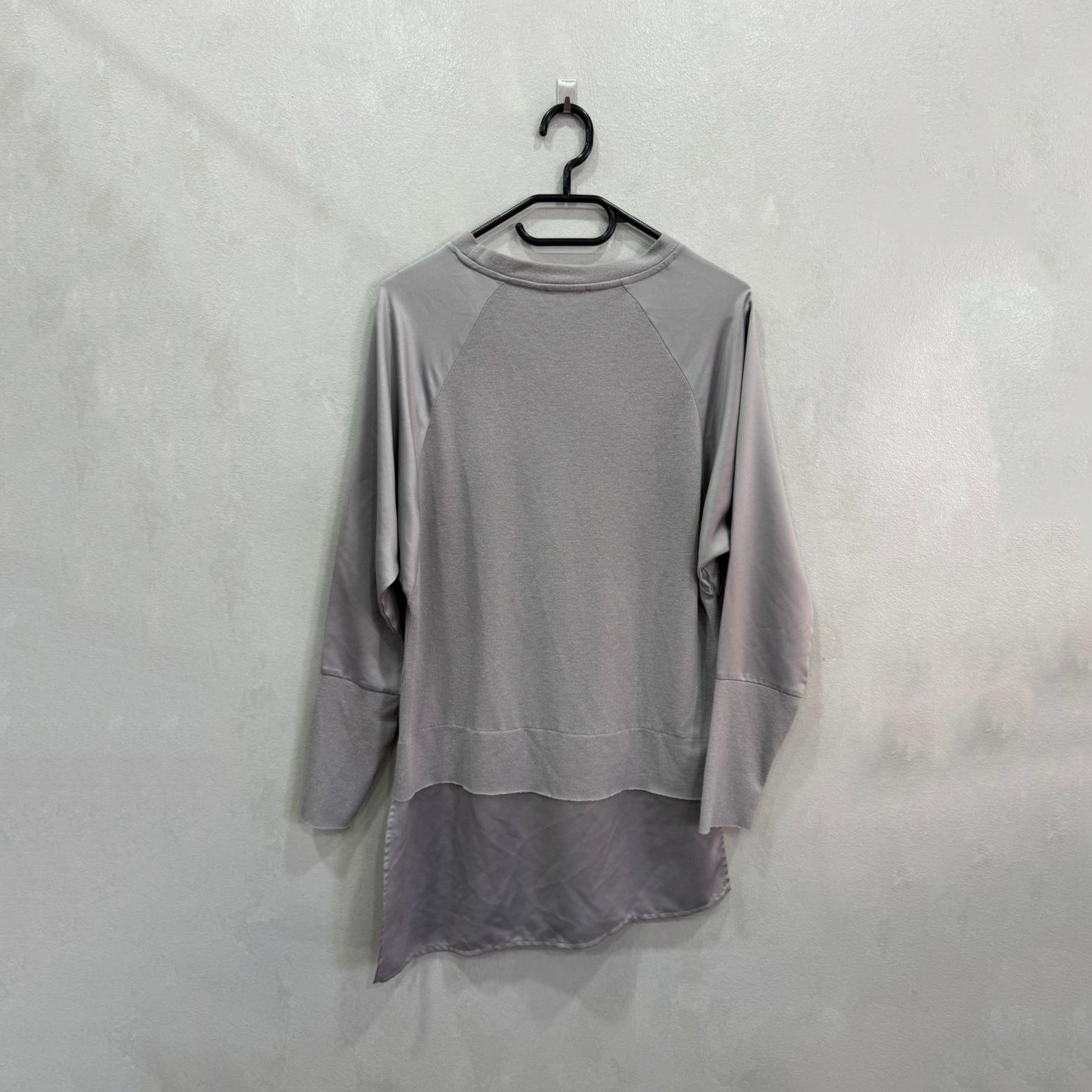 Camisola Zara, tamanho S, Grade A, em tom cinza suave. Modelo com mangas 3/4 e mistura de malha com tecido fluido na barra e laterais, criando um efeito assimétrico moderno.