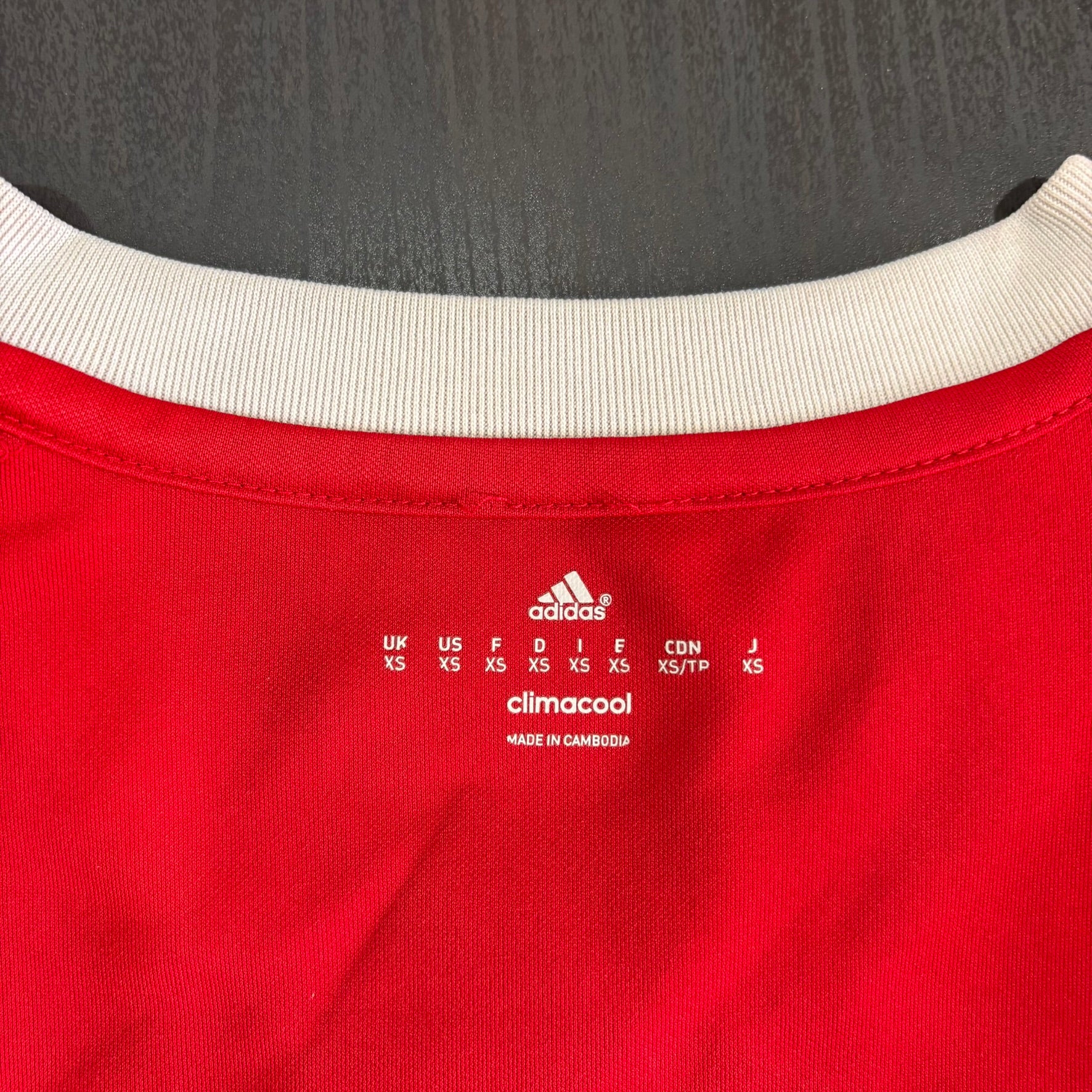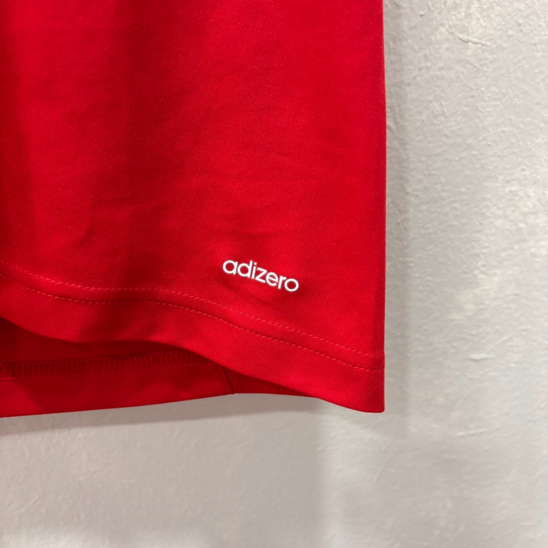 Camisola oficial do FC Bayern em vermelho, com detalhes em azul e branco nas mangas e logotipo Adidas nas costas. O modelo apresenta gola em V, três riscas Adidas nos ombros e escudo do clube bordado na frente. Tecido leve com tecnologia Climacool, ideal para treinos e uso diário. Possui aplicação “Mia San Mia” na manga.