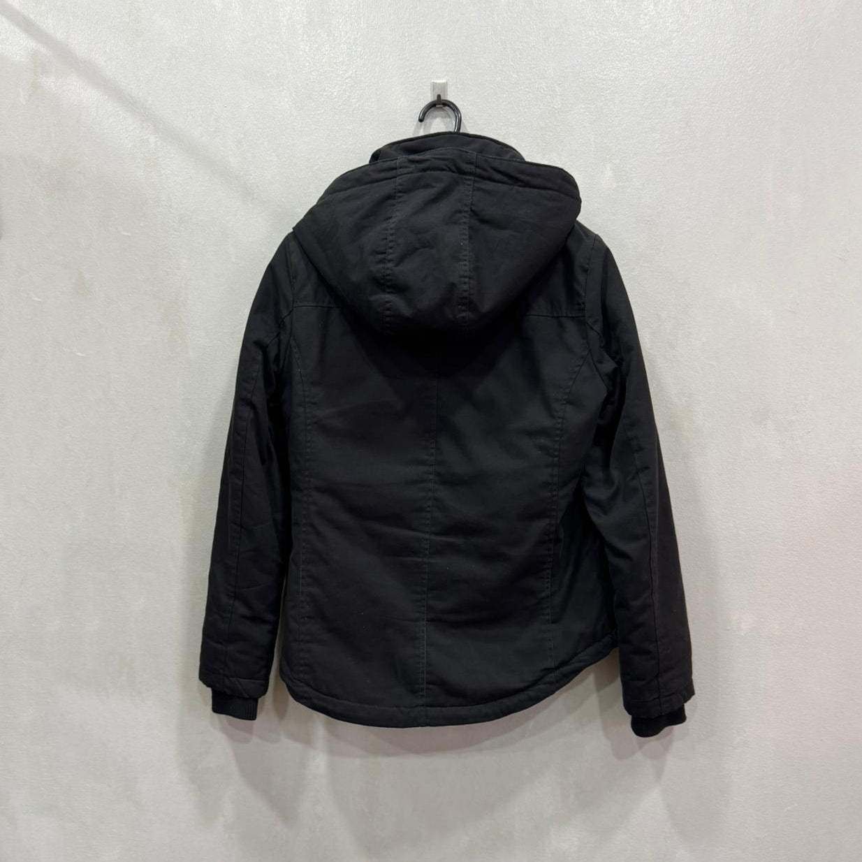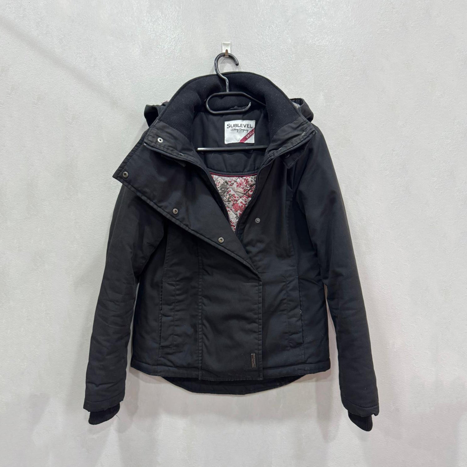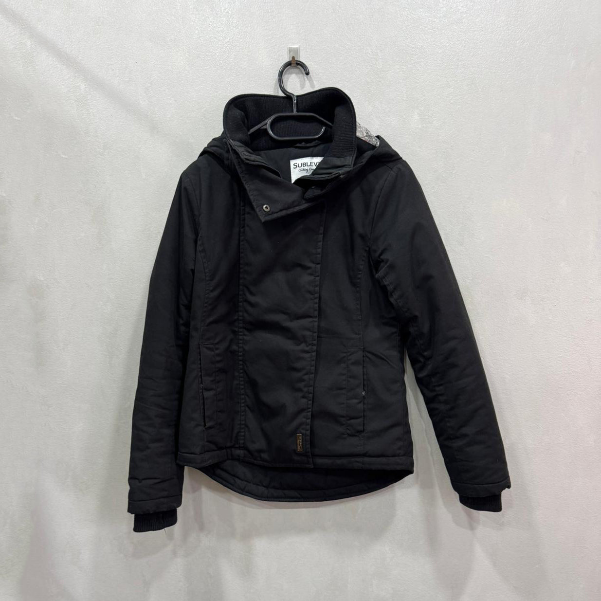 Casaco masculino Sublevel em preto, com capuz integrado e interior acolchoado. Fecho frontal com aba de molas, bolsos laterais e corte ligeiramente ajustado. Visual urbano, prático e quente.
